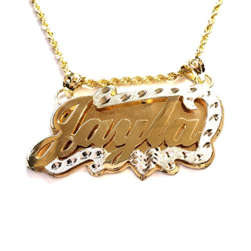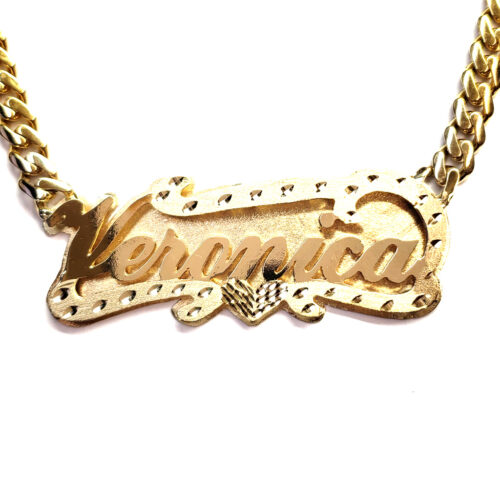 Tags: 10kt, 14kt, closed back, commercial cursive, full outline, nameplate, necklace, sterling silver