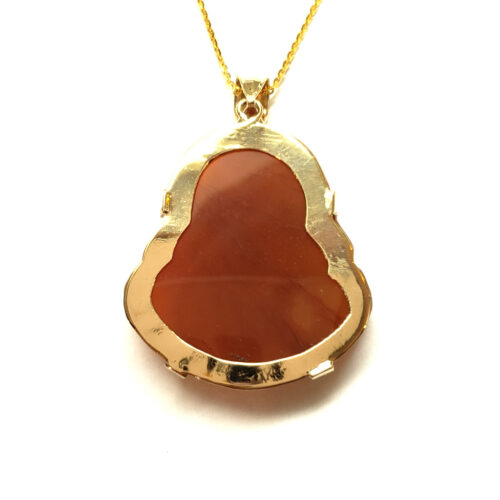 17.04 grams of total weight of 14kt yellow gold frame and red agate Buddha.