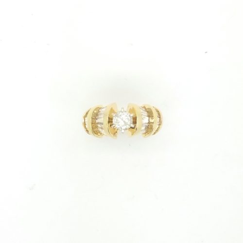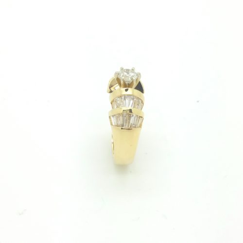 Center diamond is 0.50 ct, H color SI 1 clarity, 1.84 ct baguettes on the side.