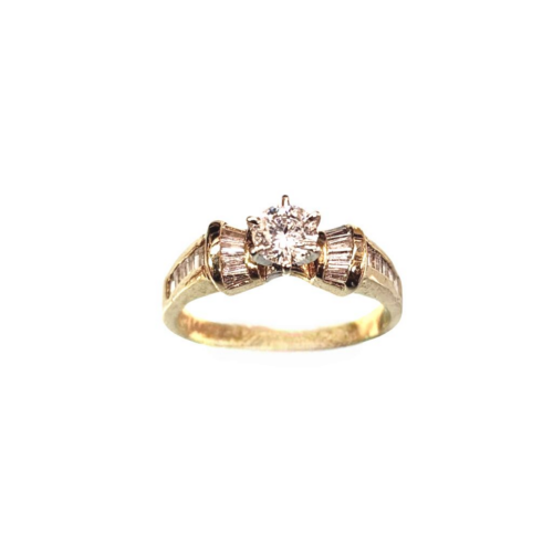 The side diamonds are 0.85 ct of SI1 quality, baguette diamonds.