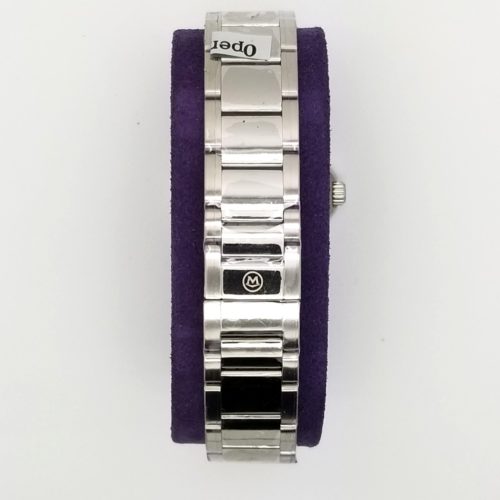 Stainless steel case with a stainless steel bracelet. Fixed bezel. Black dial with silver-tone hands. Dial Type: Analog. Quartz movement. Scratch resistant sapphire crystal. Pull / push crown. Solid case back. Case diameter: 29 mm. Case thickness: 6 mm. Round case shape. Band width: 16 mm. Band length: 7 inches. Fold over with safety clasp. Water resistant at 30 meters / 100 feet. Functions: hour, minute. Dress watch style. Watch label: Swiss Made. Movado Defio Black Dial Ladies Stainless Steel Watch 0606334.
