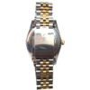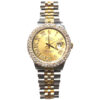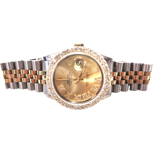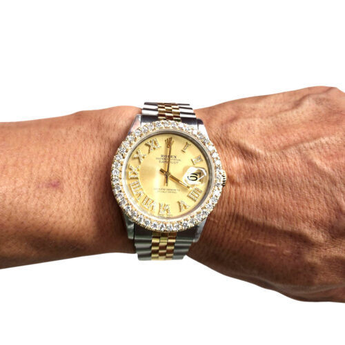It features a 36mm stainless steel case. There are 2.10 ct TW VS1 quality, round diamonds, prong set on 14kt yellow gold bezel. It surrounds a gold dial with Roman numeral diamond hour markers, totaling 0.40ct. The total weight of all diamonds on this watch is 2.50 ct TW.