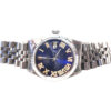 It features a 36mm stainless steel case with a 18 kt white gold fluted bezel, surrounding a blue dial with diamond Roman numeral hour markers. 0.40 ct TW of diamonds on the Roman numerals.