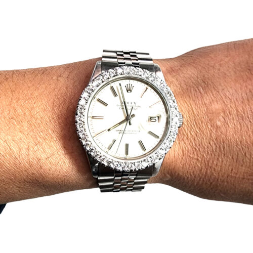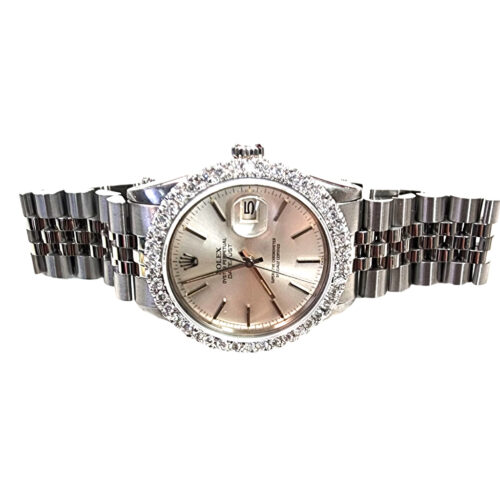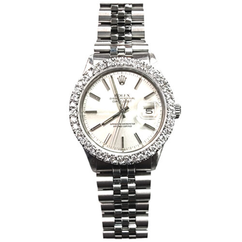 It features a 36mm stainless steel case with a 14 kt white gold diamond bezel, 2.20ct TW of VS1 diamonds, surrounding a Rolex original silver dial.
