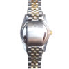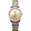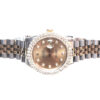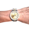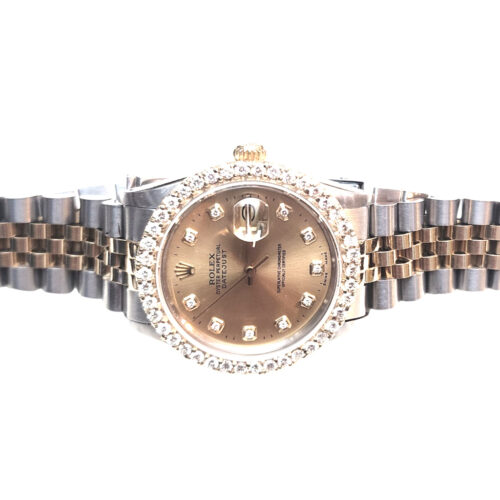 It features a 36mm stainless steel case. There are 2.10 ct TW VS1 quality, round diamonds, prong set on 14kt yellow gold bezel. It surrounds a gold dial with diamond hour markers, totaling 0.10ct. The total weight of all diamonds on this watch is 2.20 ct TW.