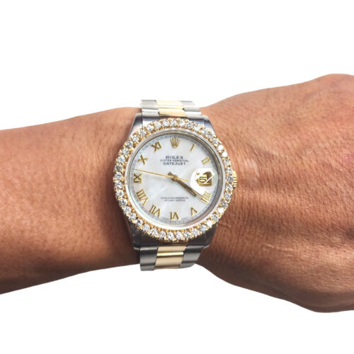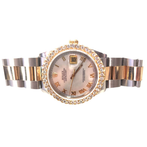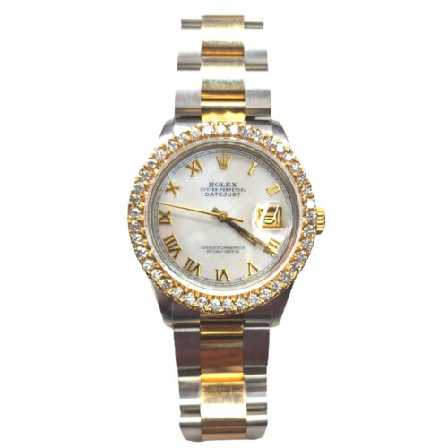 It features a 36mm stainless steel case with a 14kt yellow gold bezel with 2.40 ct TW of VS1 quality, round diamonds. The watch dial is of genuine white Mother of Pearl (MOP). It features yellow gold Roman numeral hour markers.