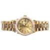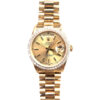 It features a 36mm 18kt yellow gold case with a 18kt yellow gold, 1.50 ct TW prong set diamond bezel. It has gold dial with regular hour markers.