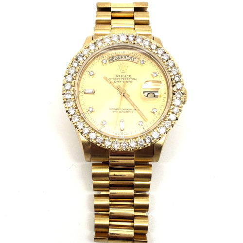 This Rolex President (1803) is an elegant timepiece. Crafted with an 18kt yellow gold case, it boasts a captivating 14kt yellow gold bezel adorned with dazzling 2.1ct TW VS1 diamonds, encircling a resplendent gold dial. It has scratch resistant sapphire crystal.